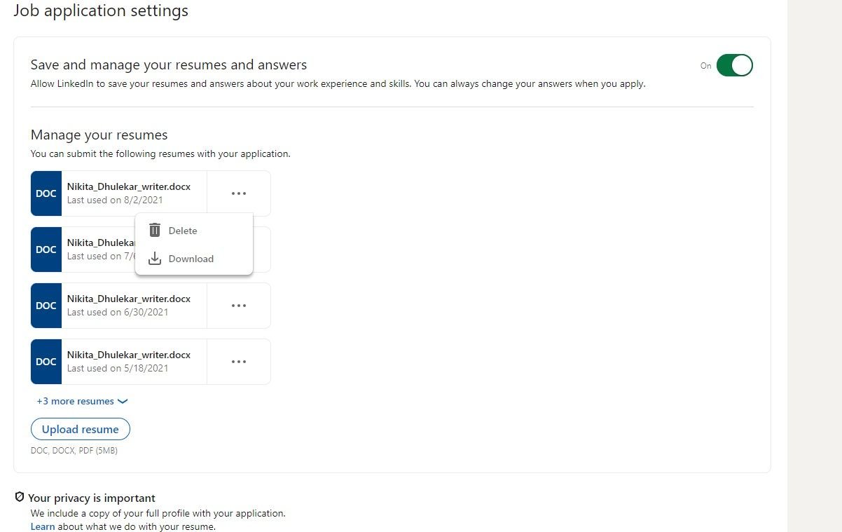 To delete or download a resume, click the ellipsis, and select the relevant option.