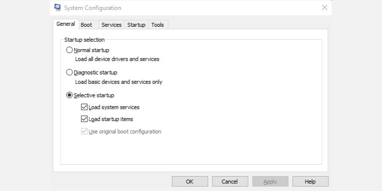 Under the General tab, you’ll see two checkboxes below Selective startup. Uncheck the second box that reads Load startup items and leave the Load system services box checked.