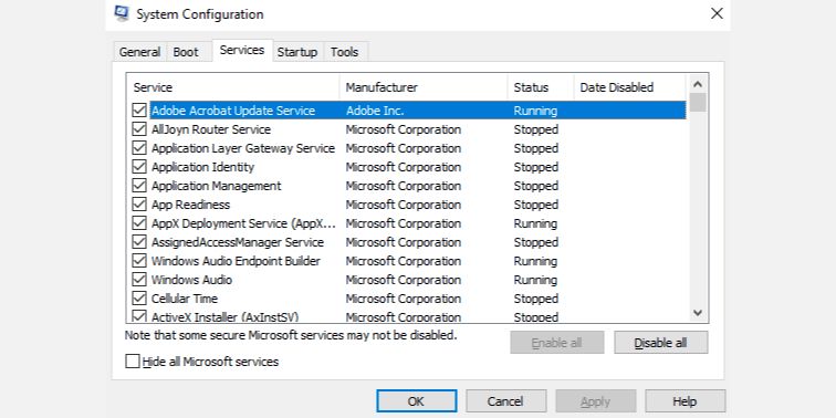 This should leave you with a small list of services. Next, click Disable all and click OK. When you restart the computer, it will boot only with Microsoft’s services. Try using the Print Screen key to see if it works now.