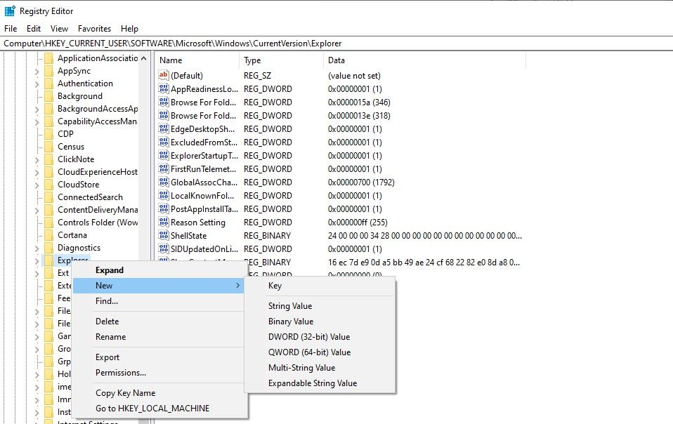 - Navigate to HKEY_CURRENT_USERSoftwareMicrosoftWindowsCurrentVersionExplorer.