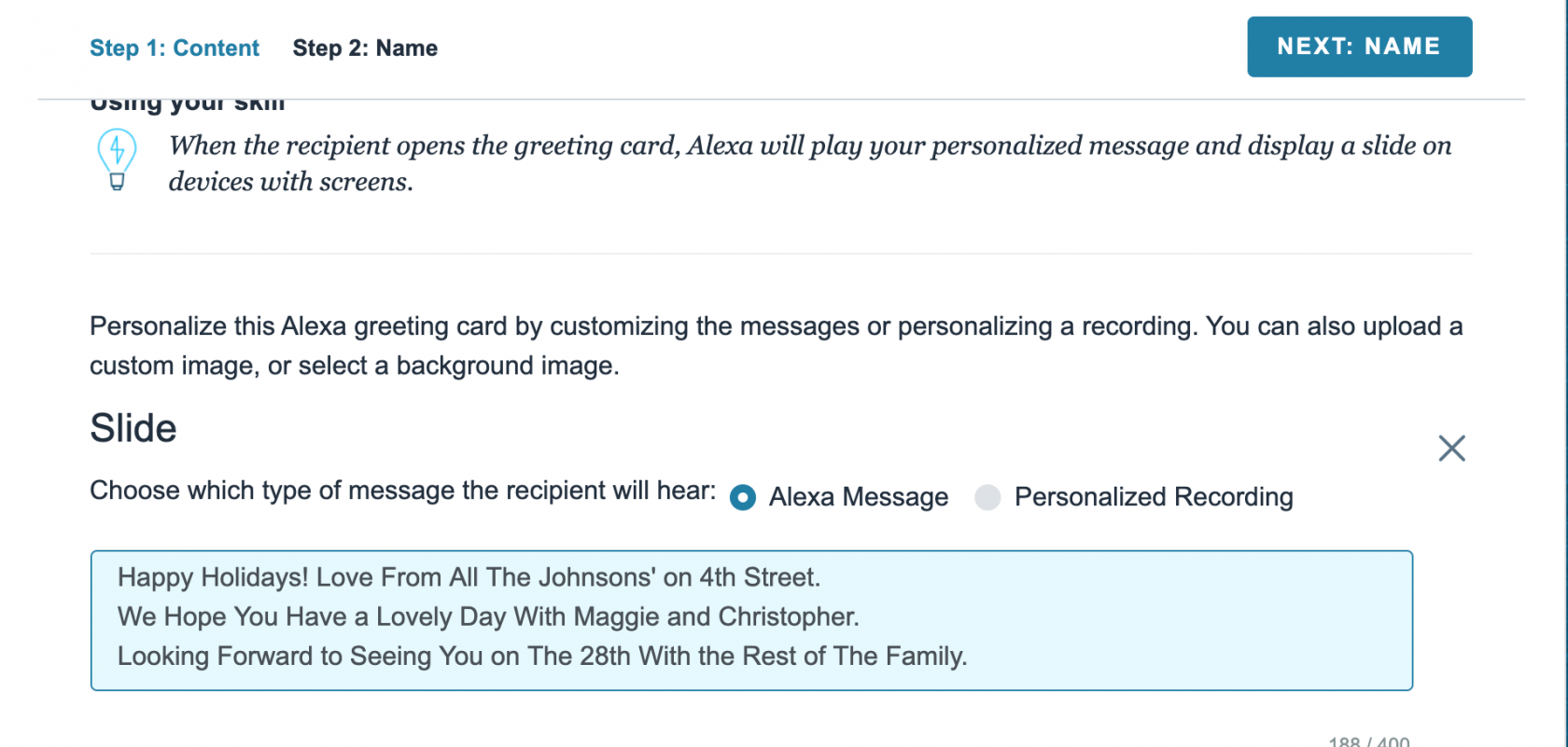 Next you have to name your skill, so when you send the command to Alexa, she knows what she is responding to. For example; “Alexa, send Christmas Day Card to Maggie and Christopher Newbold.”
