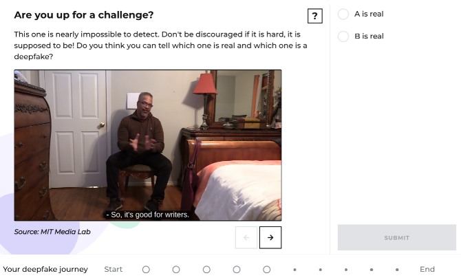 MIT’s Detect Fakes is another short quiz to compare two videos side-by-side. One is real, the other is fake. Can you figure out which one is the deepfake? MIT offers a hint for each test, and after you answer, educates you about the signs you should look for.