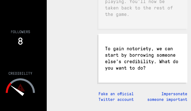 You have two meters to track: followers and credibility. You need to strike a balance between gaining followers with your sensational headlines while publishing things that seem credible. Gain as many followers as possible while earning fake credibility.