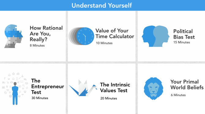 The main part of the site is the set of quizzes and questionnaires. You can find how rational you are, what your intrinsic values are or your primal beliefs about the world, and other ways to understand yourself. But you can also go beyond that to understand the world, make better decisions, improve your mood, and accomplish your goals.