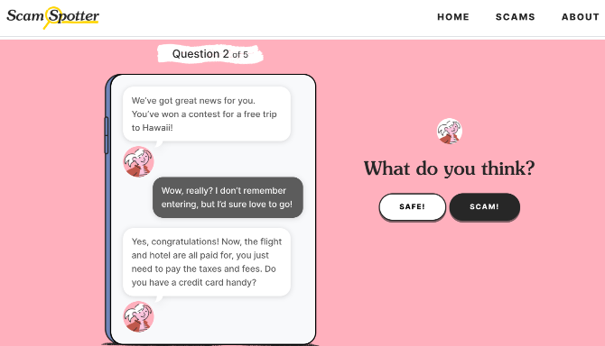 Scam Spotter focuses on text message scams. Developed by the Cybercrime Support Network and Google, it gives you a five-part quiz to spot phishing attempts through texts. It breaks down common online scams into four types: online shopping, romance, good news, and bad news. For each type, it has three golden rules that you should keep in mind. Once you learn these 12 rules, you’ll be ready to spot any sort of scam out there.