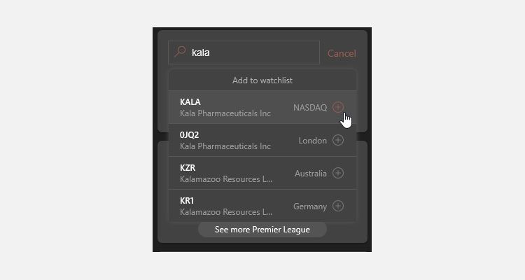 - Type the stock ticker or name of the business you want to track, then press the Plus symbol to add to the card.