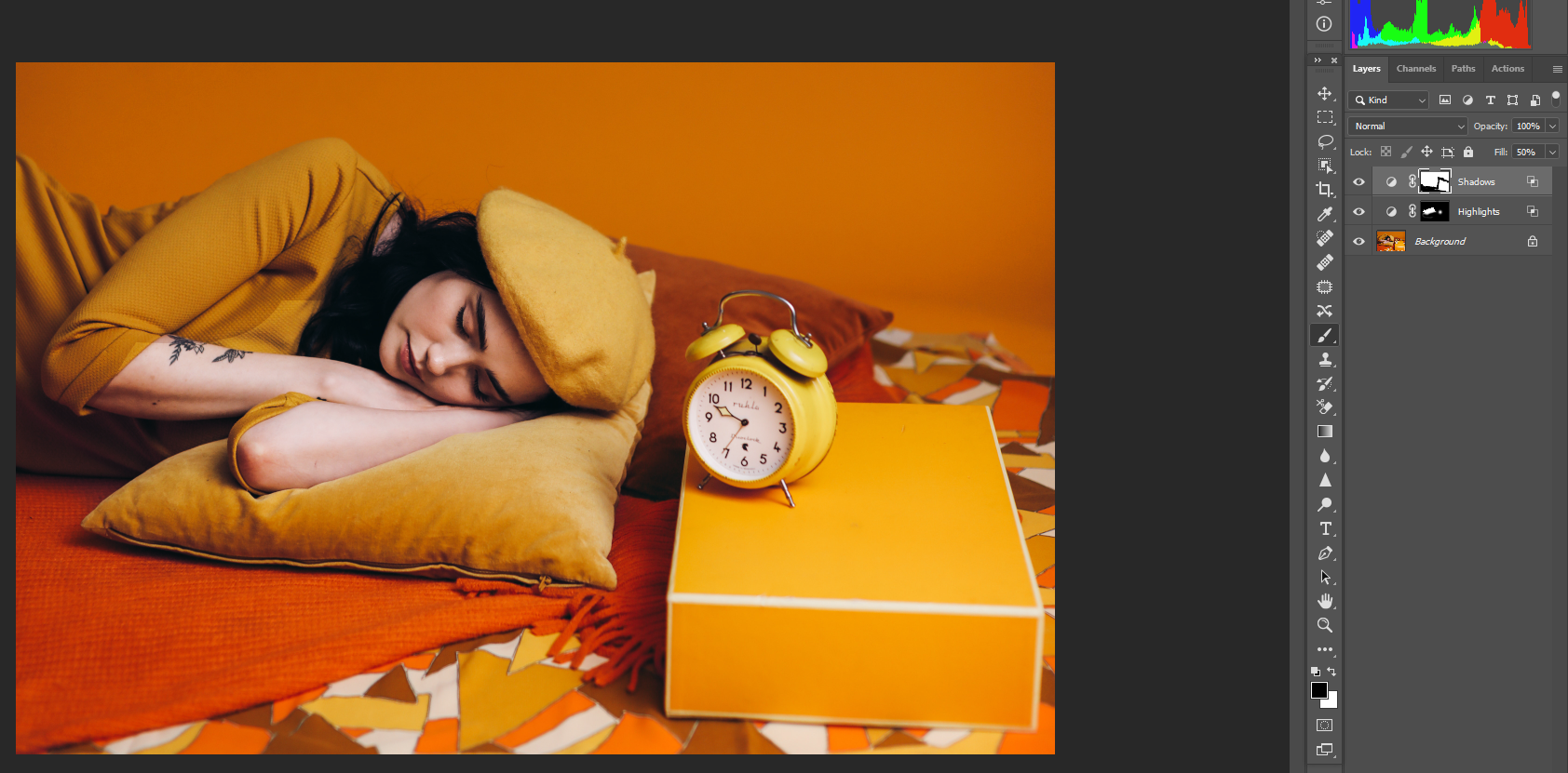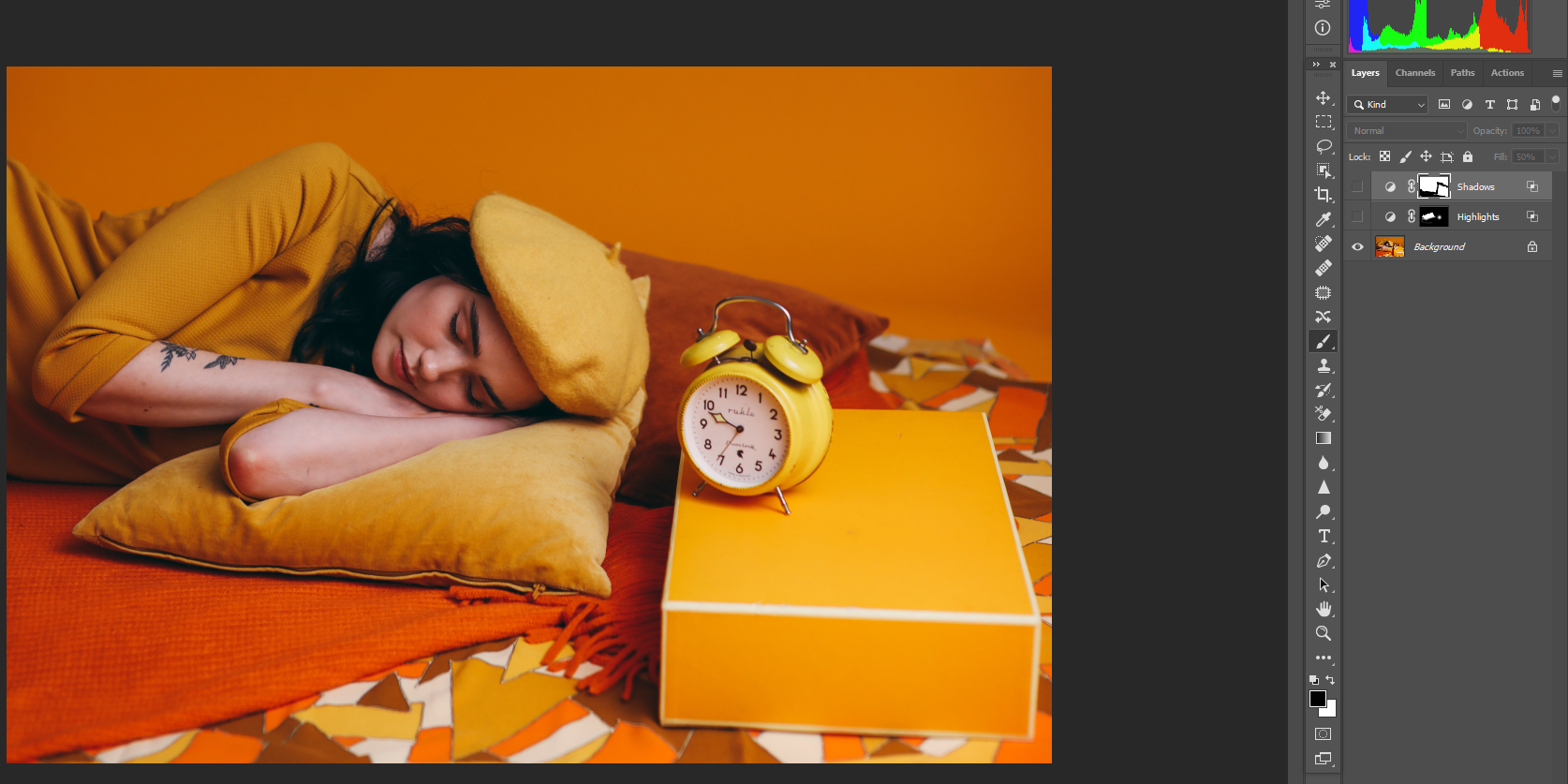 12. Select the Highlights layer mask. Press B for the Brush tool and change the foreground color to Black. Then, paint in the original colors except for the skin areas, as shown. We cover the basics of the Brush tool if you need a refresher.