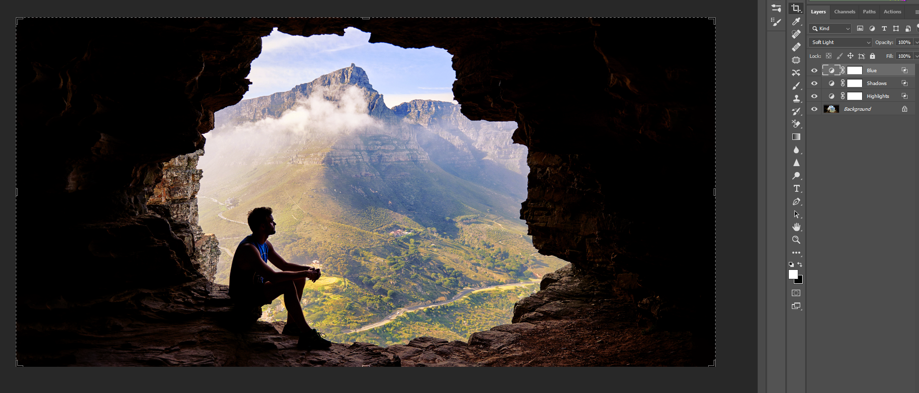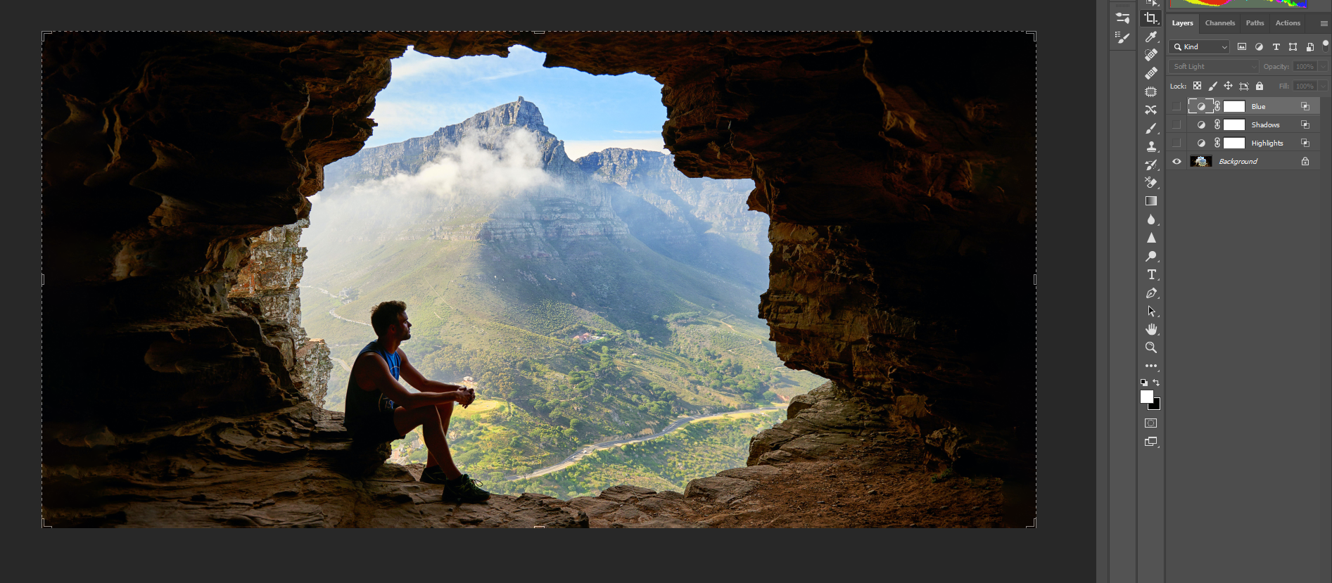 We will apply the same principles in this landscape image. We’ll add warmth to the scene outside the cave, as well as add blue and cyan to the shadows. This will create more contrast and a very different overall look and feel.