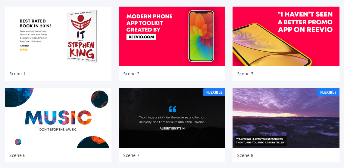 The first thing to do in Reevio’s studio is to select the Add Scene button. You can then choose between the types of animated slides, their range, and style.