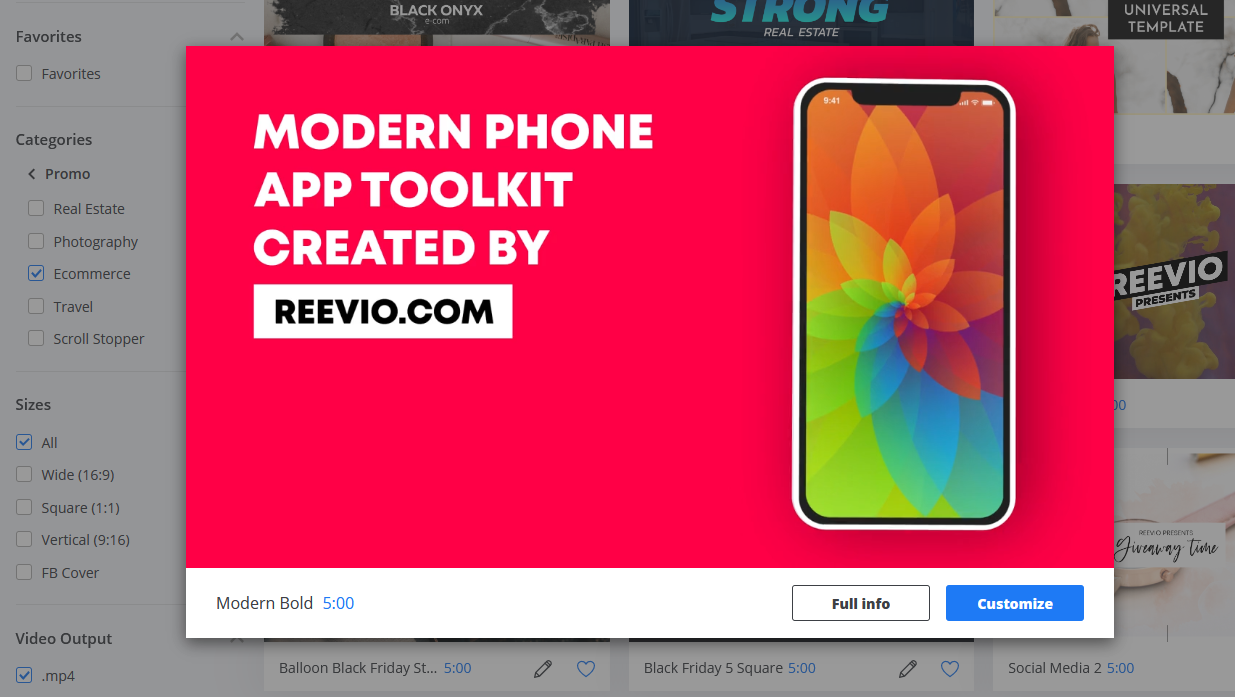 For example, you can view templates of a specific size: wide, square, vertical, or Facebook cover. If a MOV video output fits your project better than an MP4, you can tick that preference too and browse the results.
