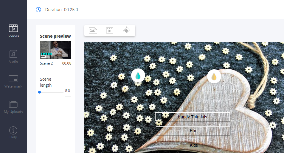Now, you need to work on each part of your project. Add images, videos, and background colors using the buttons above your slide. From the left-hand menu, you can add watermarks too.
