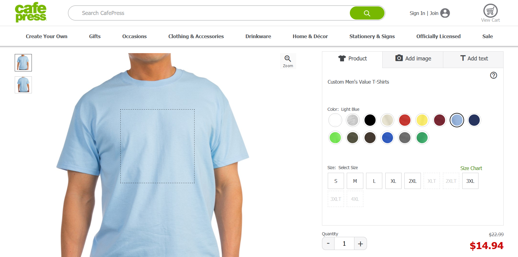 Here’s another good choice for designing quality t-shirts and other products quickly. It’s easy to get to Zazzle’s clothing editor, which has the same options as higher-end services, including clipart.