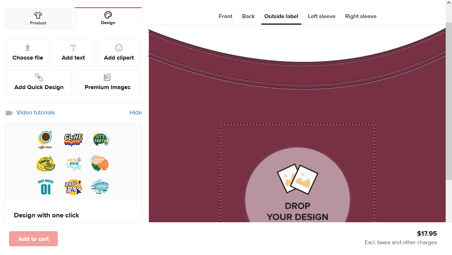 Even without a custom upload, you can create unique designs, thanks to its free, readymade artwork. There is a premium selection too, but you pay a small fee for each image.