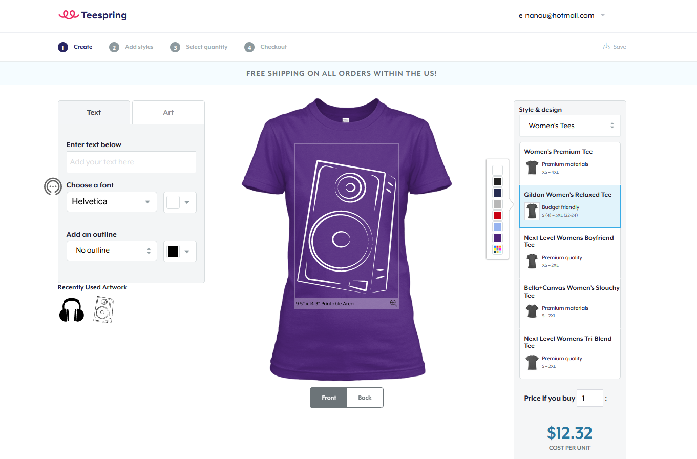It’s good to have a variety of options when working out where to make t-shirts online. Spreadshirt is also simple to use, letting you upload images, share your designs, and save them to finish later.