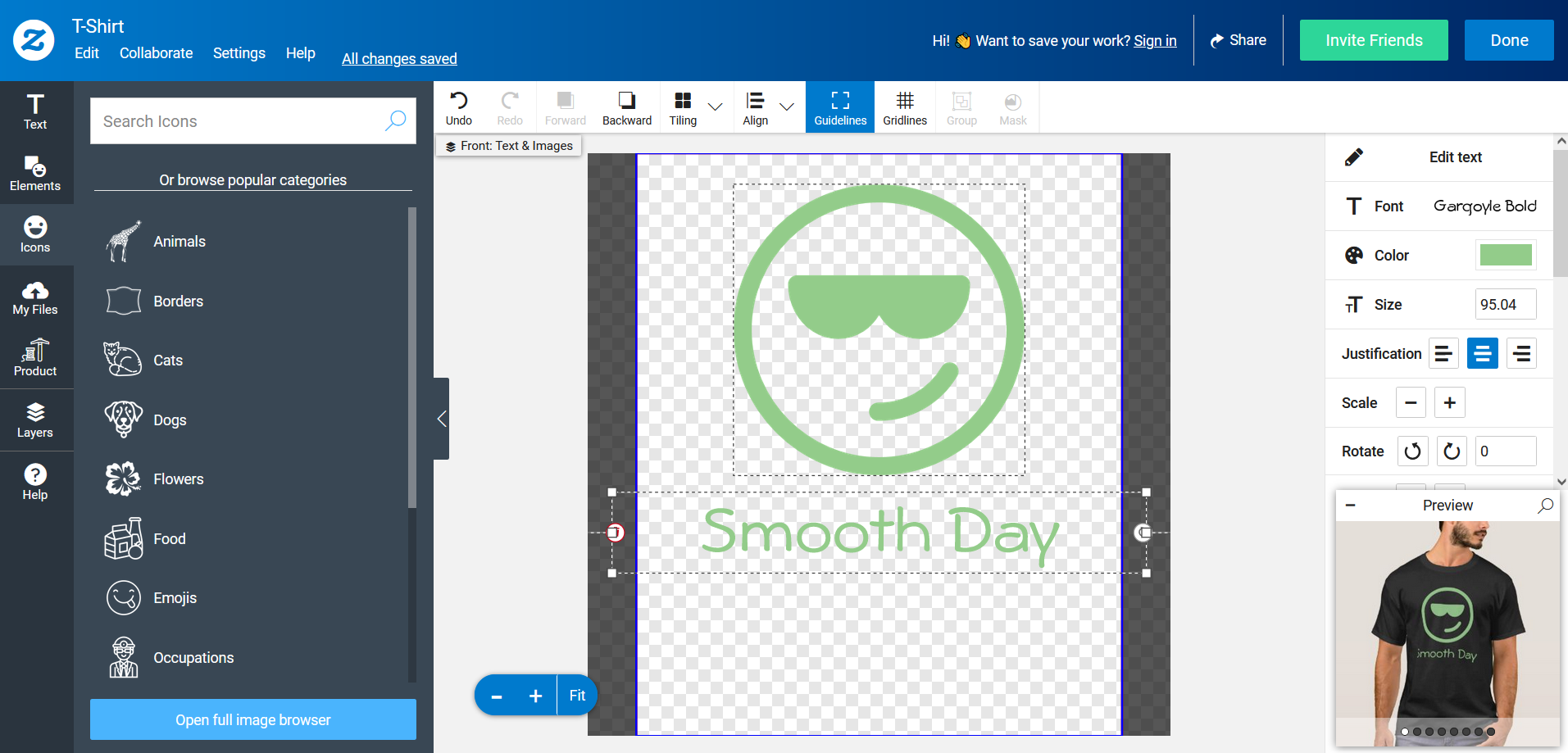 On the other hand, you could start from scratch for something really unique. Add several lines of text, and experiment with images, shapes, and graphics. See what they look like on different kinds of t-shirts.