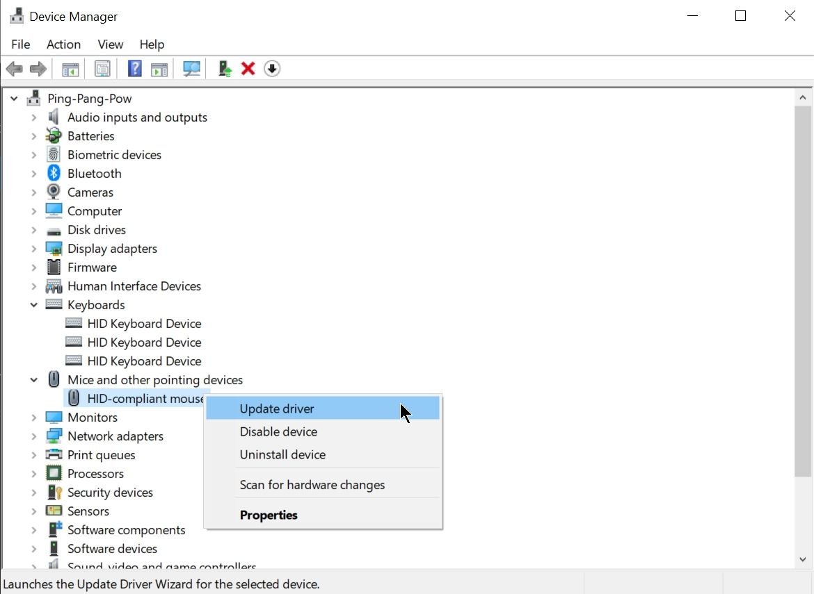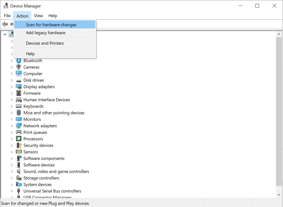 - On the Device Manager toolbar at the top, select Action > Scan for hardware changes.