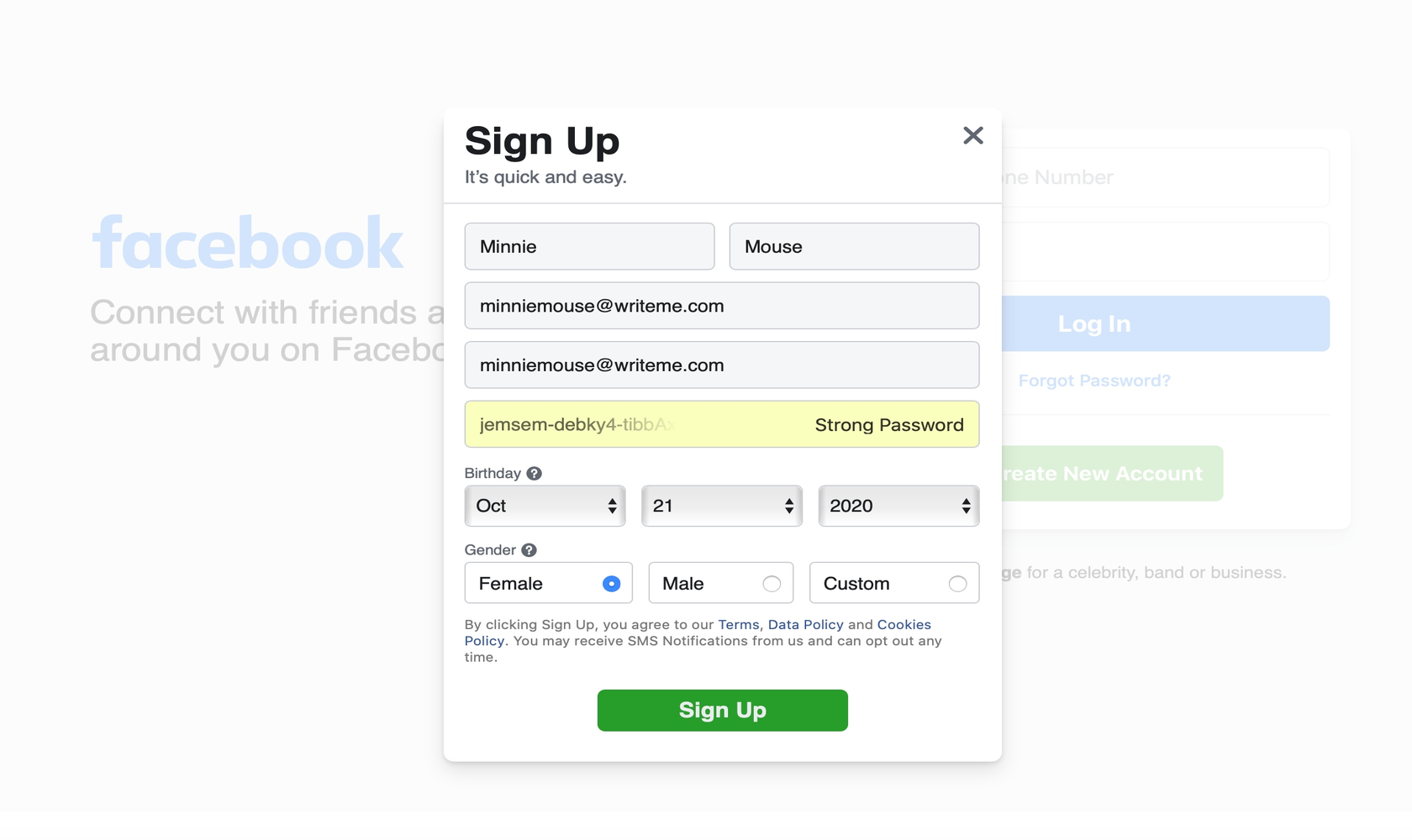 Insert your new email address, a strong password, a fictional birthday, and preferred gender. Hit the Sign Up button.