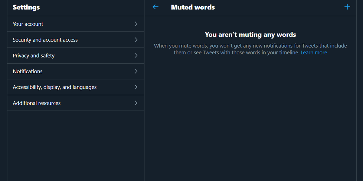Select Muted words, then select the plus icon. You can now type in the word or hashtag you’d like to mute. You can only add one word or phrase to your list at a time.