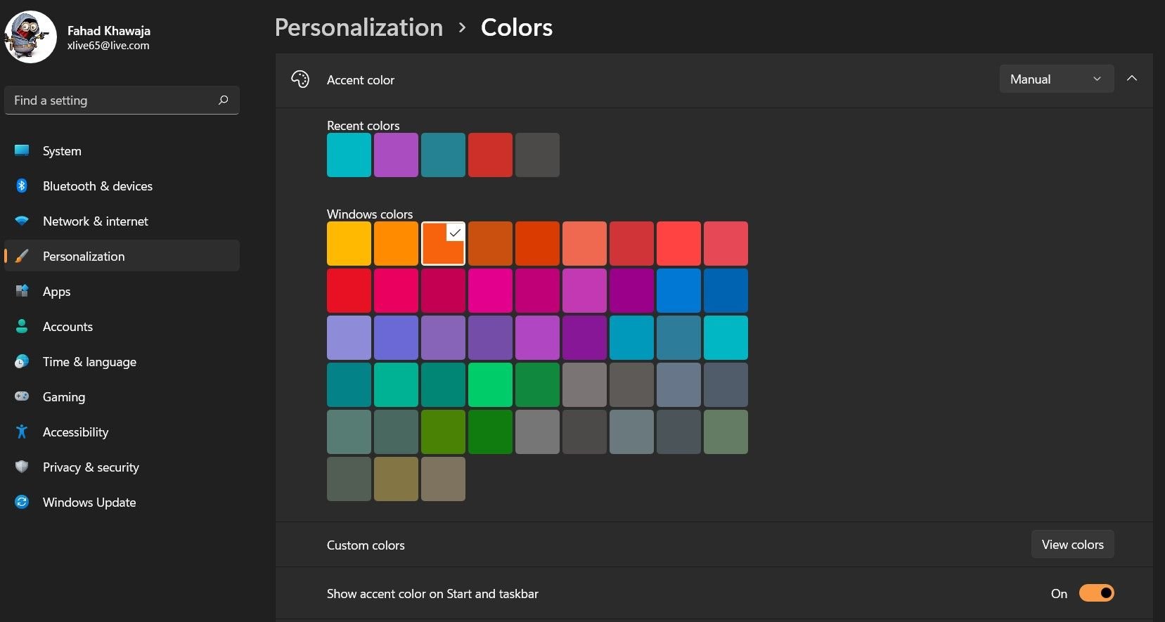 3. Under Accent color, choose the color you want for the taskbar and Start menu.