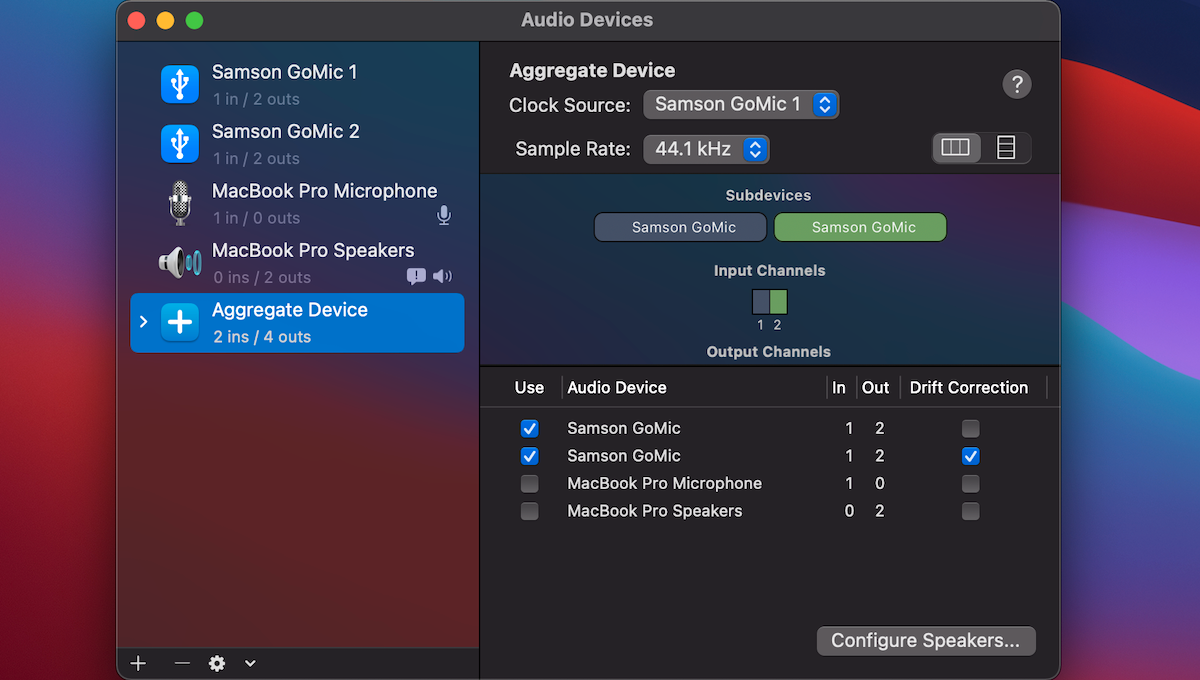 Once selected, you can also change the Clock Source and Sample Rate of your new device if you like. Make sure that for whichever device isn’t the clock source, you have Drift Correction checked.