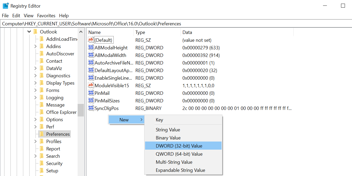 HKEY_CURRENT_USERSoftwareMicrosoftOffice.0OutlookPreferences - Once you’re there, right-click somewhere blank on the right pane and select New > DWORD (32-bit) Value.