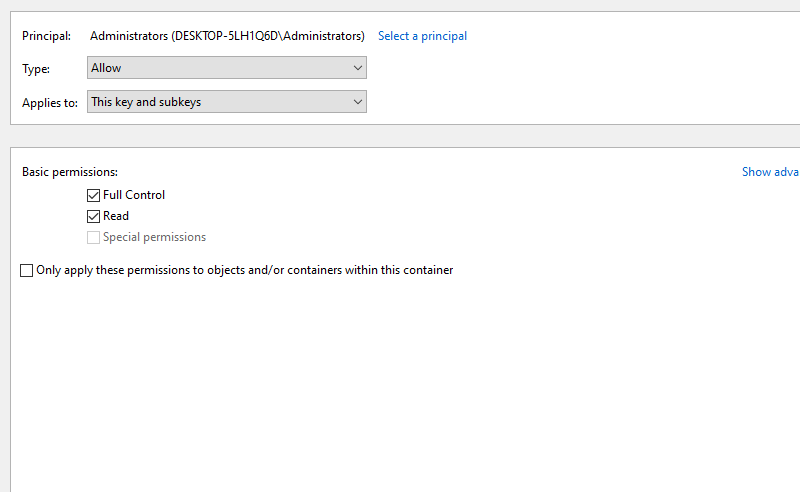 On the Permissions window, select Advanced. This will open the Advanced Windows Security Settings. At the top of the window, you'll see a Change option besides the Owner of the key.