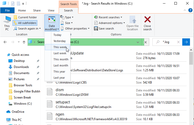 There are likely to be thousands of results across many different folders, so it’s wise to filter the list to show only the most recent events. Click the Date modified button on the File Explorer toolbar and choose Today, Yesterday, or This week.