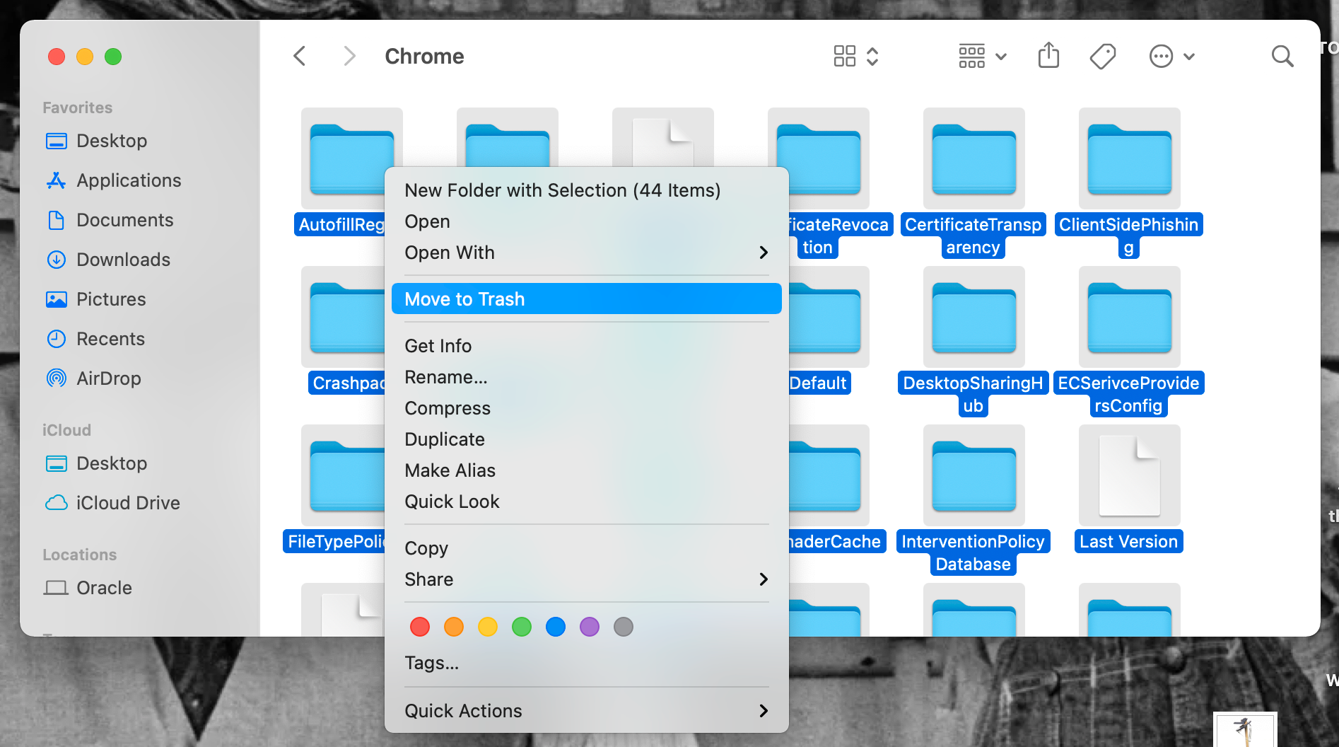 You’ll be taken to the folder on your Mac where Google Chrome has stored its data. Select everything in this folder by hitting Cmd + A. Then drag it all to the Trash icon, or Control-click on the highlighted files and select Move to Trash.