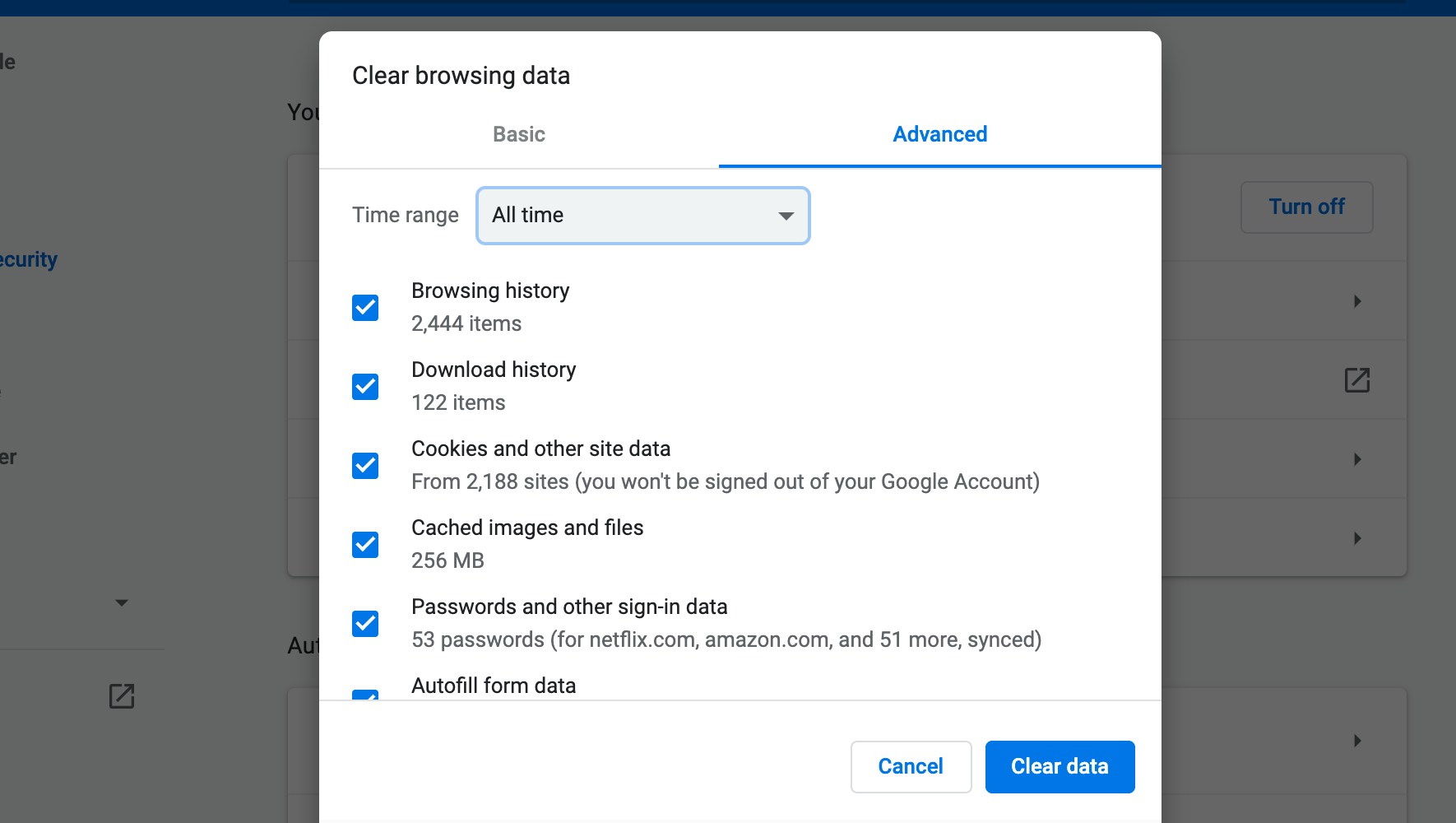 However you get there, a window will appear for clearing out your browsing data. Select All time from the Time range drop down, and check every box in the list of data types. You should consider clicking on the Advanced tab and checking all the boxes there too.