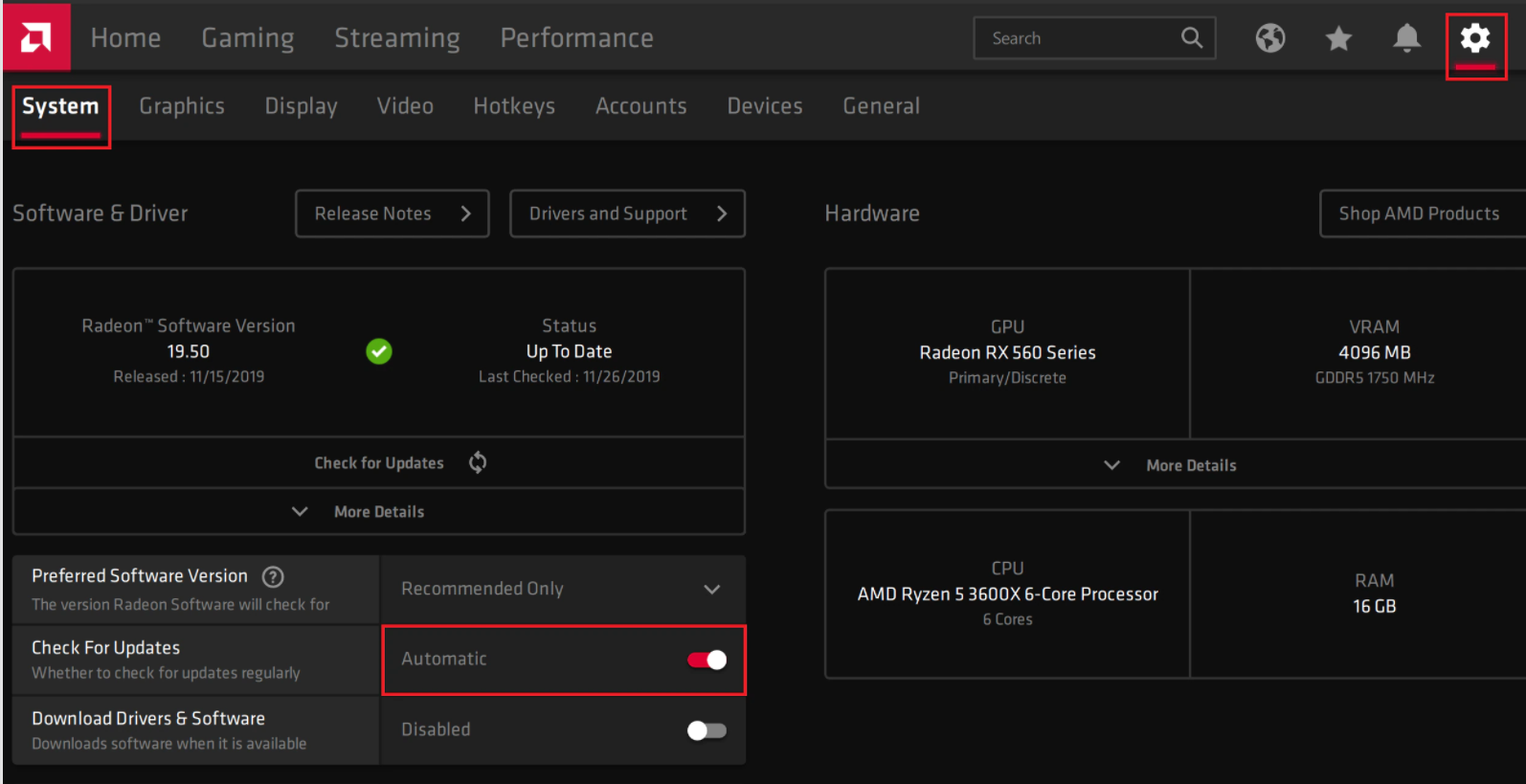 Once the program opens, click the gear icon in the top right corner, followed by System. This will open up the section where you can see the Radeon Software version that you are running. You can also see the driver information and your computer’s hardware specifications here.