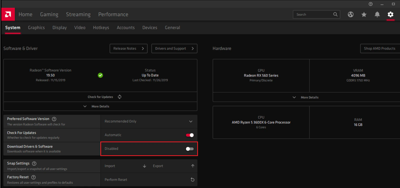 Under the Software & Driver section, you can see the version of the Radeon Software you have and the status of the drivers. If you are running an older software version, you will see it under Status. Just below this section, you can see the Check for Updates button. Hitting this button will check if there are any updates available.