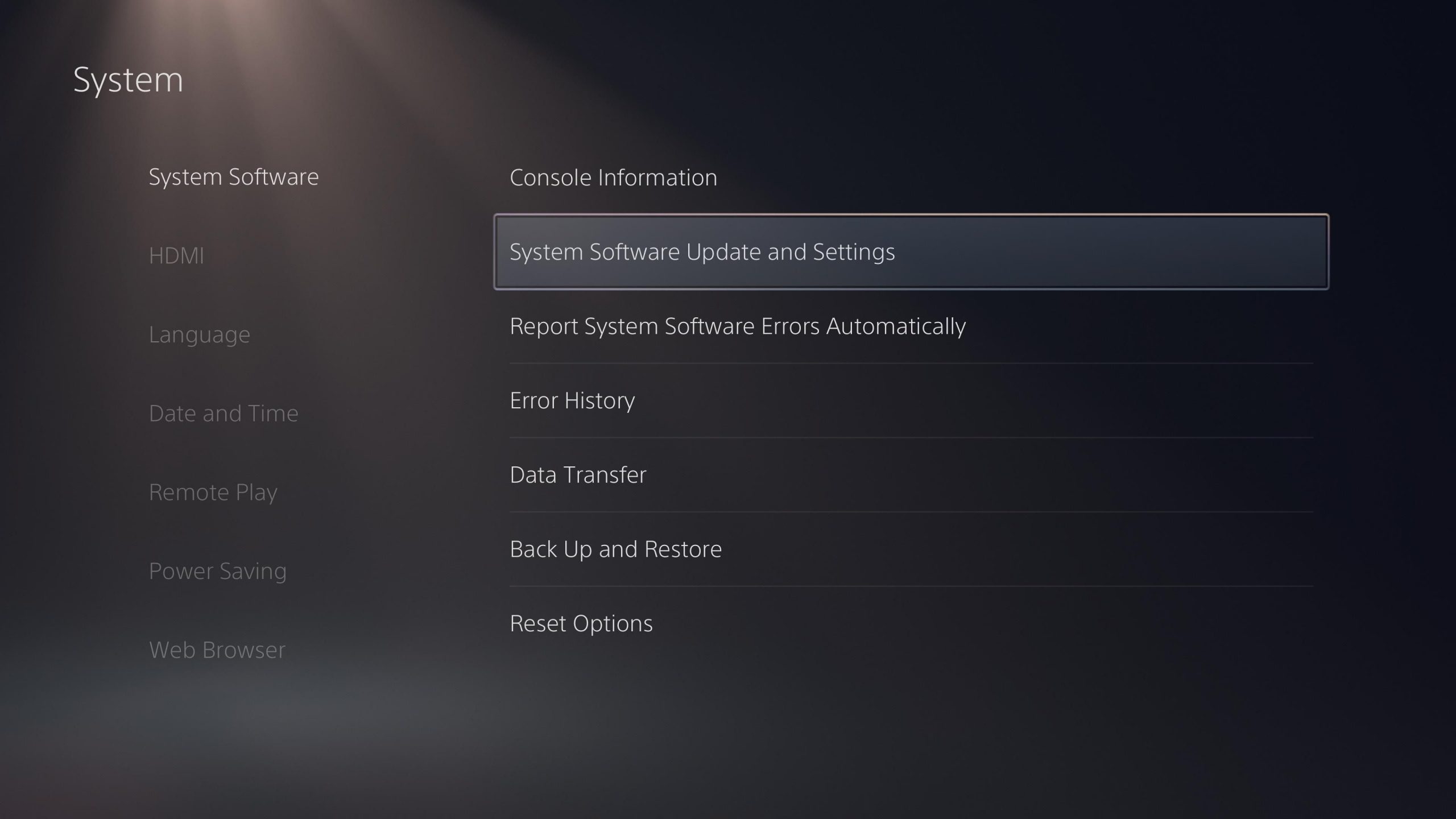 Next, make sure you have the System Software section highlighted on the left. Then pick System Software Update and Settings from the list of options.