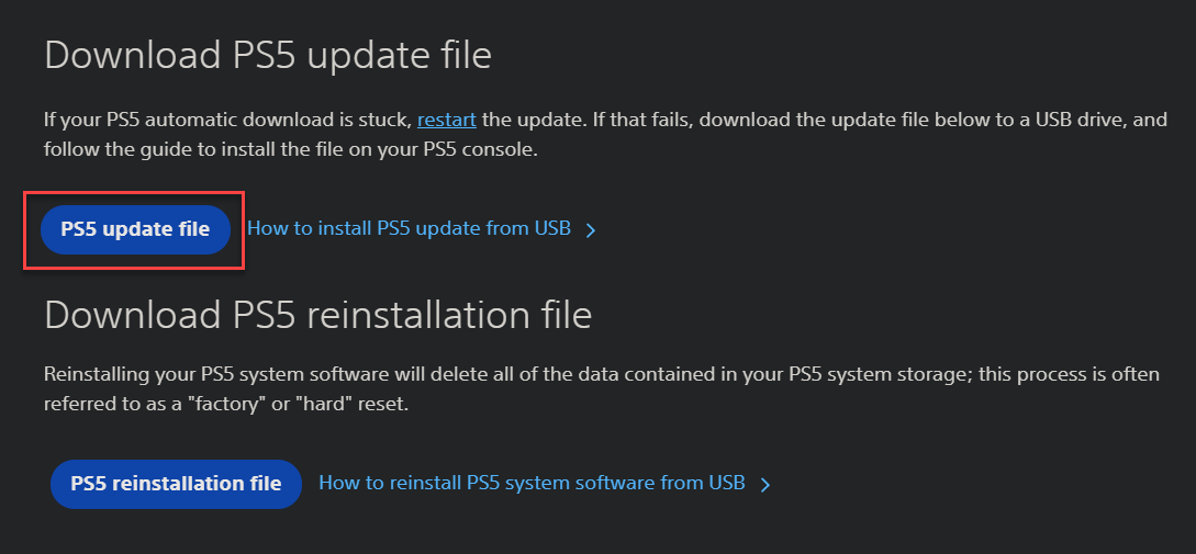 Then, download the latest PS5 update file from Sony’s PS5 system software page. Make sure you get the update file; the PS5 reinstallation file below it is for completely reinstalling the system software, which is akin to a factory reset.