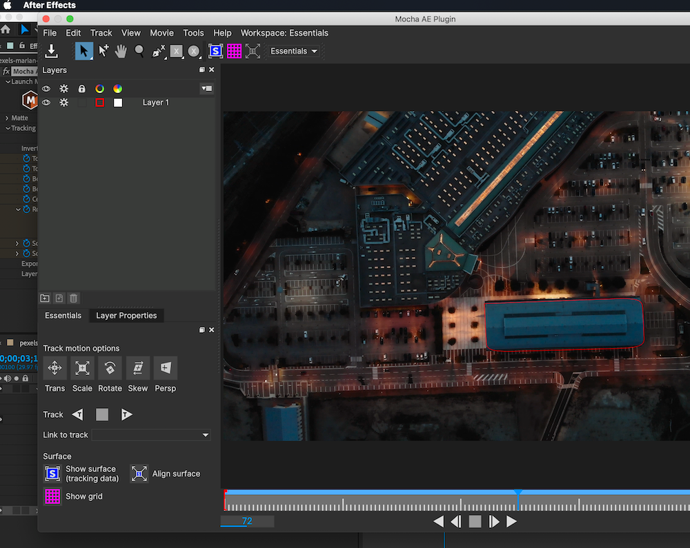 Once again, use the X-Spline pen tool to draw around the building and track the motion, closing the Mocha AE plugin when you are content with the track.