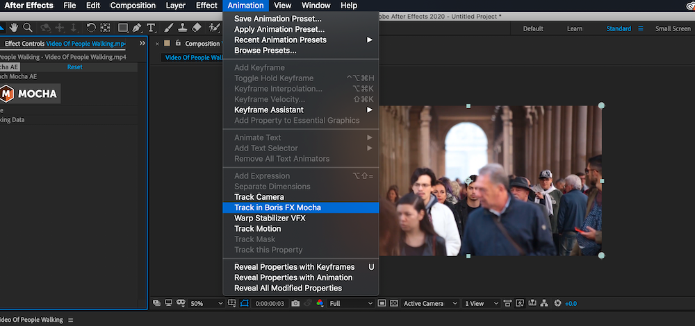 Mocha AE is licensed by Adobe and is incorporated inside After Effects. Once you’ve loaded footage into your composition in After Effects, select the clip you want to track and click Animation, then Track in Boris FX Mocha.