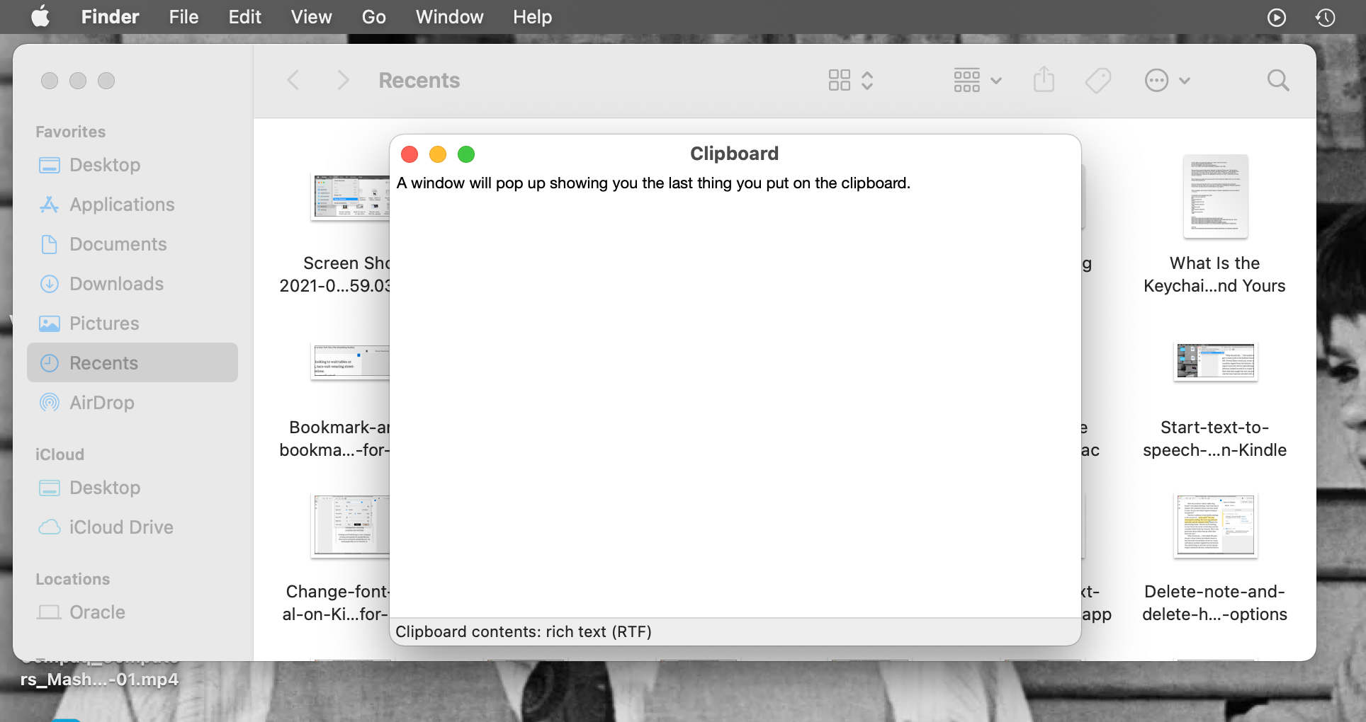A window will pop up showing you the last thing put in the clipboard. It will only do this with the main clipboard and the Universal Clipboard, not the secondary clipboard we talked about in the last section.
