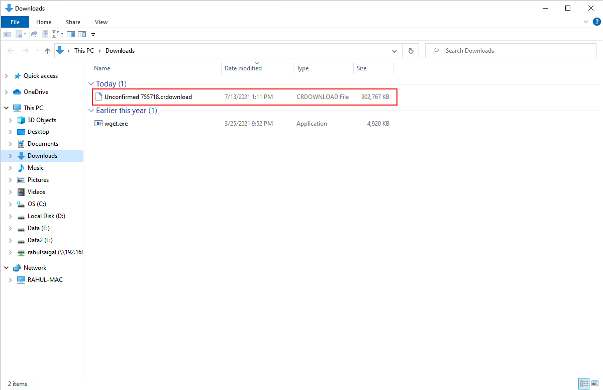 When your file gets partially downloaded, Chrome gives a default name of “Unconfirmed [Random Number].crdownload.”