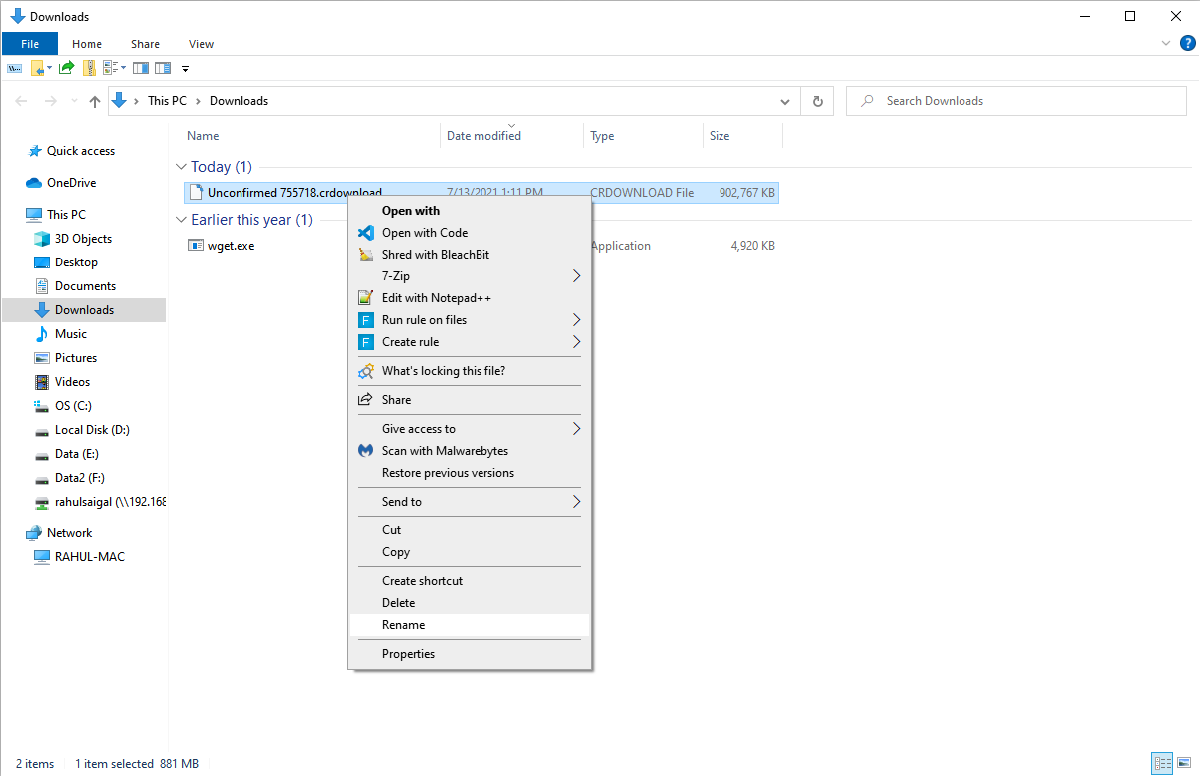 Right-click the partially downloaded file and select Rename. Remove the .crdownload extension from the end of the file and press Enter.