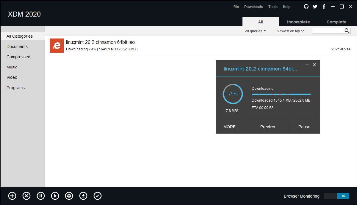 It is a free, cross-platform alternative to IDM. The app has a simple and intuitive interface and uses a similar kind of multi-threading technology to speed up your downloads. It can resume interrupted downloads due to dropped connections, network problems, and unexpected power outages.