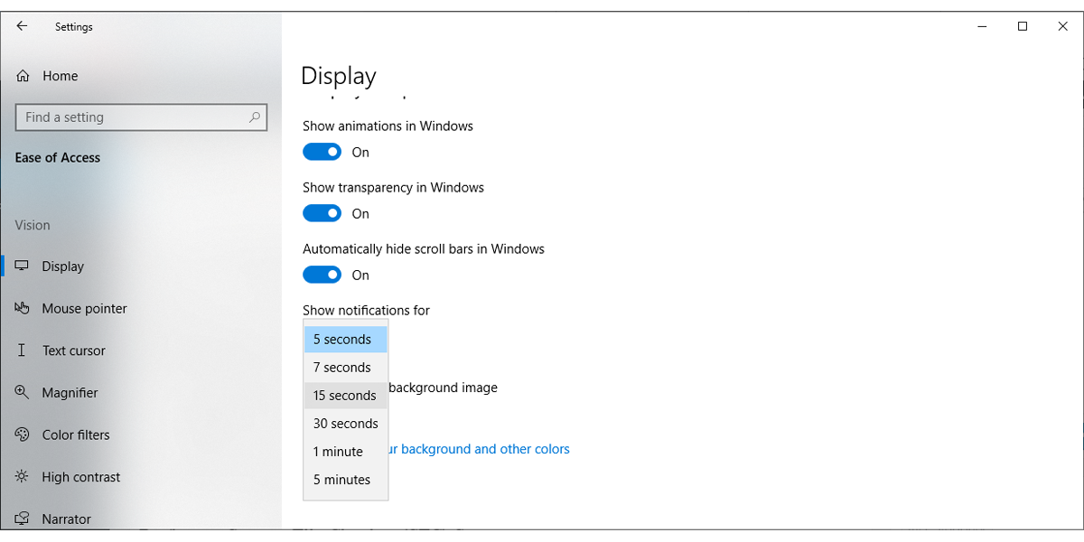 - Use the drop-down menu below Show notifications for to select for how long Windows 10 displays notifications.