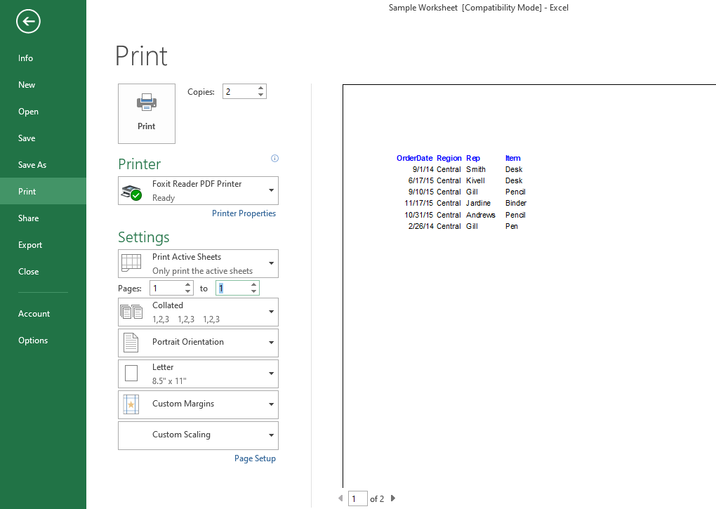 While printing sheets from the file menu, the preview is not detailed, particularly large sheets with more columns. You can have a more in-depth look at the printing sheet by going into the Page Layout View in the View ribbon.