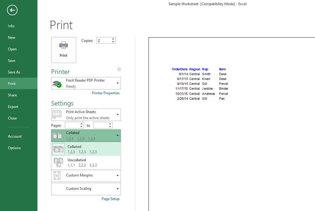 - Collated: Using this printing option, excel prints documents in three sets starting from pages 1 through 30. For the first time, you’ll get a printout of all 30 pages. After that, it prints the document again from beginning to end, and then it does it a third time.