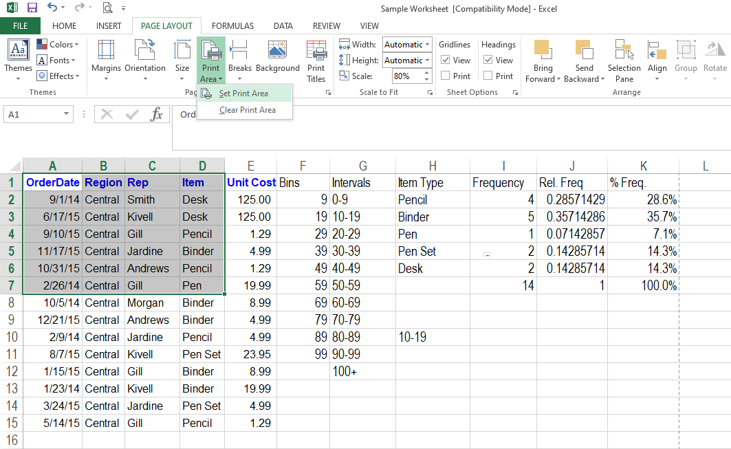 3. Click on Set Print Area, and Excel will show you a preview with a dotted line around your selected entries.