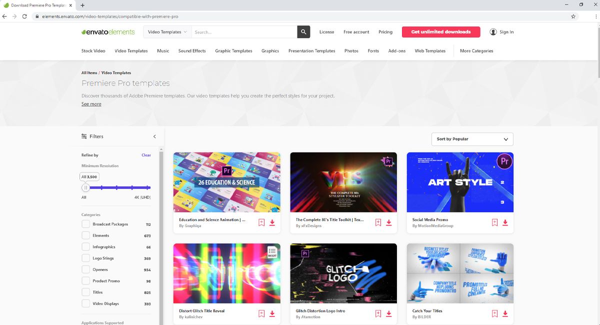 Envato Elements offers unlimited downloads of millions of creative assets. The site offers templates for Premiere Pro, stock video, music, graphic templates, stock graphics, presentation templates, photos, and website templates.
