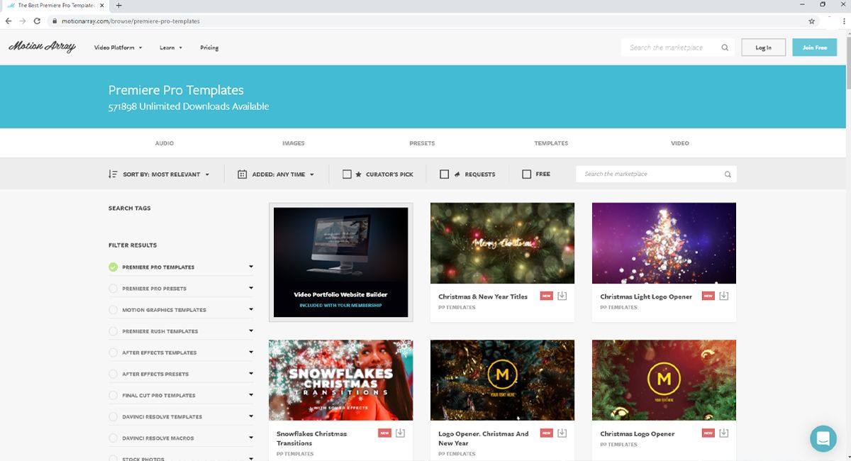 Motion Array includes templates for Adobe Premiere Pro, After Effects, Final Cut, Davinci, and Motion Graphics, as well as stock motion graphics, sound effects, videos, music, and photos. Beyond allowing you to select the platform or type of asset you are seeking; Motion Array offers additional filtering for resolution and version.