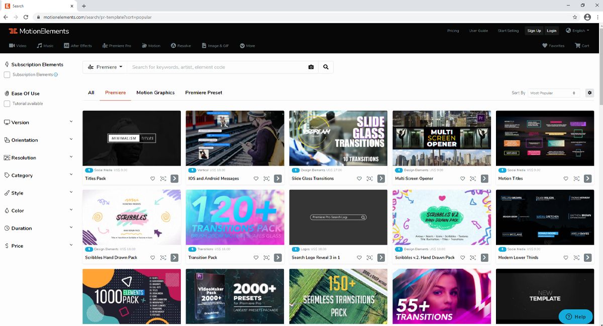 MotionElements offers a diverse set of filters making your search that much easier. The site offers standard filtering by software, category, and style, but the enhanced and impressive options are ease of use (tutorial available), software version, orientation, resolution, and duration.