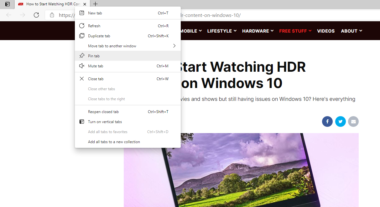 If you need to keep one or more websites permanently open while you’re browsing the web, Edge allows you to pin them. To pin a tab, right-click on the tab and select Pin tab.