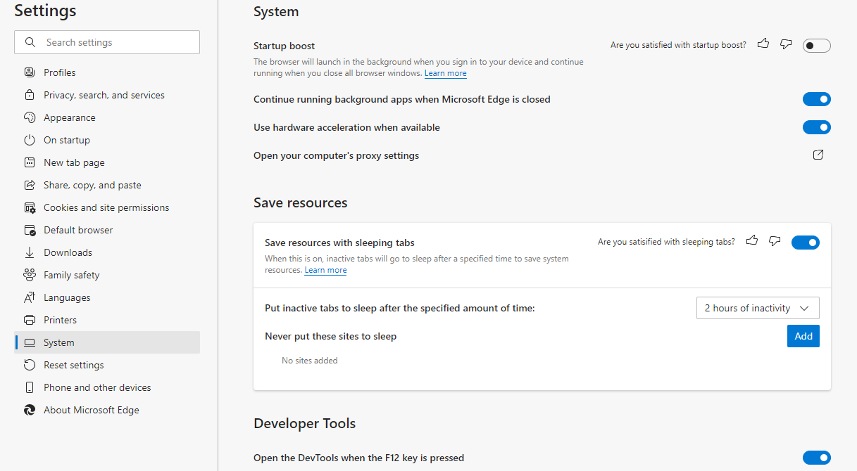 To put tabs to sleep, click on the ellipsis icon at the top-right of your browser and go to Settings > System. Under the head Save resources, make sure the slider next to Save resources with sleeping tabs is turned on. Below you’ll see an option to choose the duration of inactivity after which you’d like Edge to put tabs to sleep.