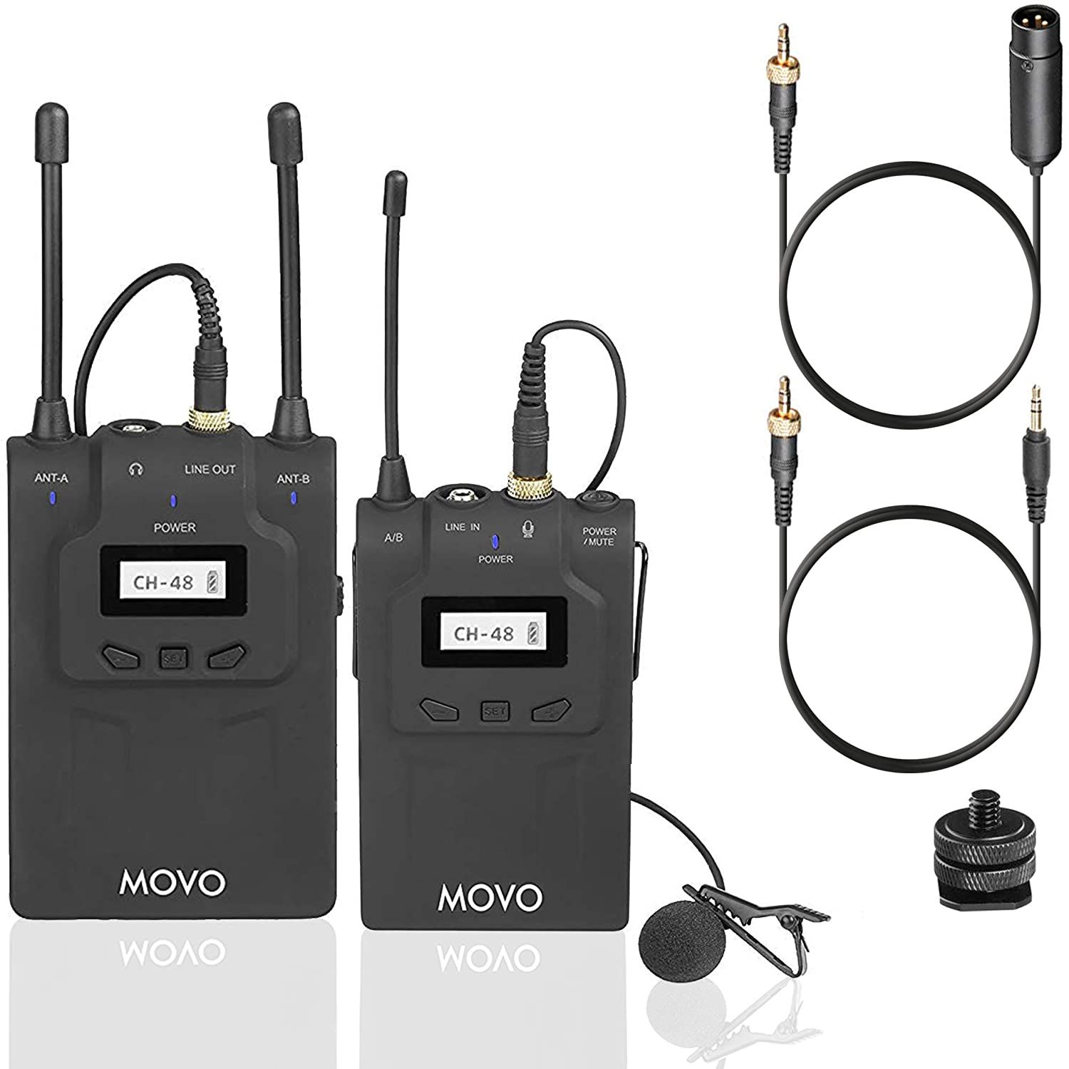 The Movo WMIC80 is an omnidirectional wireless lavalier microphone featuring a radio transmitter that you can easily clip on. The kit also includes a camera shoe mount suitable for DSLR cameras.