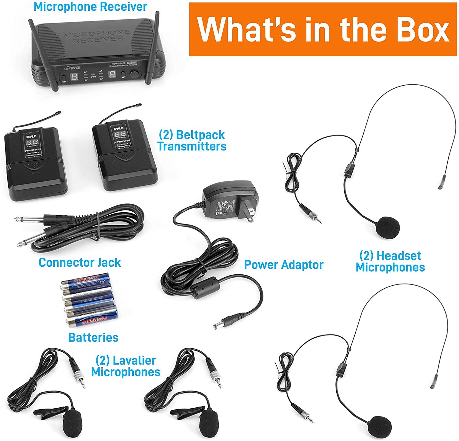 Included are two headset microphones which are ideal for dual-use. Placing the headsets on different channels offers no interference. The lengthy cables from the microphone to the transmitter offer enough room to walk around, even for taller individuals comfortably.
